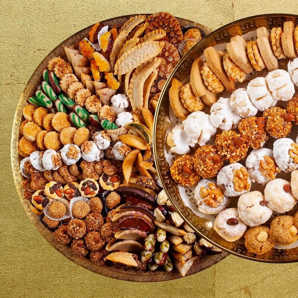 - La collection Festive, pour vos événements d’entreprise, mariages, anniversaires, fête de l’Aïd. Des assortiments servis sur de somptueux plateaux de cuivre et d’argent.