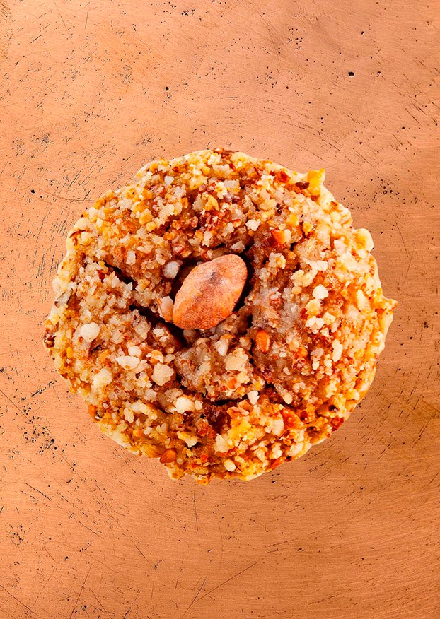 Cette Ghriba aux fruits secs est une variation élégante du macaron oriental, où la richesse des amandes, noix et noisettes se mêle à une texture fondante et généreuse. Subtilement parfumée aux zestes de citron et relevée d’une touche de vanille, elle est délicatement enrobée de praliné, pour une finition gourmande et raffinée.